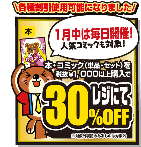 202412.27 本 【本・コミックコーナー】お得情報♪ ※各種割引利用OK! 1月は毎日が本曜日!! 期間中は本・コミックがとてもお得に買えちゃいマス★ ※セール対象外POPの貼ってる商品のみ対象外となります。 セットコミック千円ガチャもS賞増量中!! チラシ期間中はお買い得です!!是非マンガ倉庫那覇店へお越し下さい!!