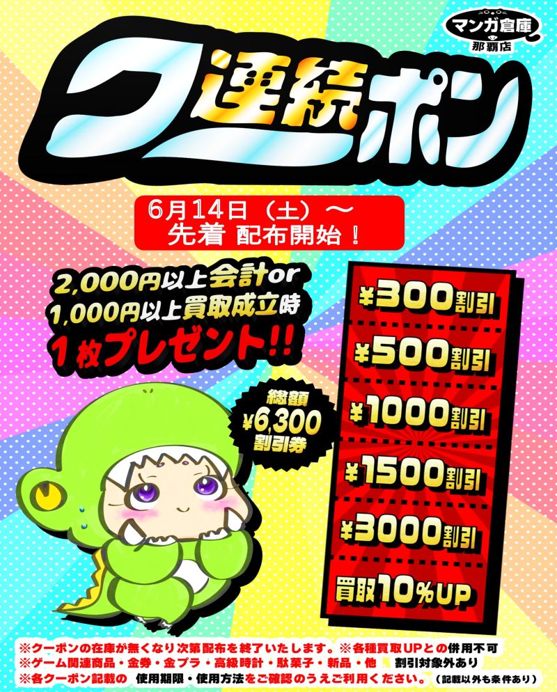 202506.11 イベント 【連続クーポン】6/14(土)~配布!! 6/14(土)~より¥2,000以上のお買い物、¥1,000以上の買取成立で1枚配布します!!!無くなり次第終了!!!長きに渡って安くお買い物が出来るチャンス!!!是非GETして使ってください!!!