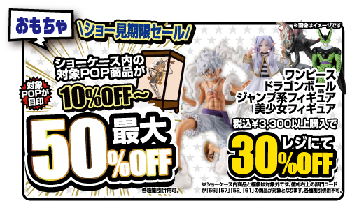202604.10 おもちゃ 【TOY】マンガ倉庫那覇別館7周年セール!! R.8 4/11日(土)~R.8 4/19(日)の期間中 おもちゃコーナーにてお得なセール開催します!! 期間中は 【ワンピース系フィギュア】【ジャンプ系フィギュア】【美少年フィギュア】【ドラゴンボールフィギュア】がお買い得になります!! ショーケース外にある対象商品を税込み¥3,300-以上お買い上げで30%OFF!! 更にショーケース内には最大50%OFFのPOPも出現⁉