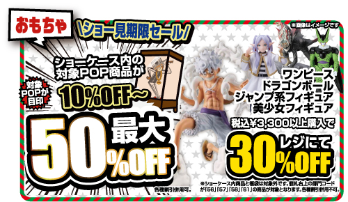 期間中は 【ワンピース系フィギュア】【ジャンプ系フィギュア】【美少年フィギュア】【ドラゴンボールフィギュア】がお買い得になります!!
