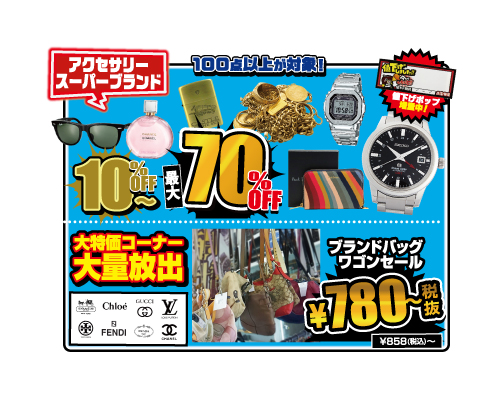 202603.13 スーパーブランド アクセ・スーパーブランドからのお知らせ!! アクセサリーコーナーでは、厳選された100点以上のショーケース内商品が10%OFF~最大70%OFFになっちゃいます! 価格高騰中の貴金属はネックレス、リング、ピアスなど随時商品揃っています! スーパーブランドコーナーでは大好評企画のブランドワゴン祭りを開催! 海外セレブブランドのカバンがなんと780円(税抜き)~と大変お買い得に! ぜひ、お得にブランドバッグを手に入れてください!!早い者勝ちになりますよ!!是非ぜひマンガ倉庫那覇店へご来店下さい!