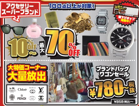 202604.10 スーパーブランド アクセ・スーパーブランドからのお知らせ!! アクセサリーコーナーでは、厳選された100点以上のショーケース内商品が10%OFF~最大70%OFFになっちゃいます! 価格高騰中の貴金属はネックレス、リング、ピアスなど随時商品揃っています! スーパーブランドコーナーでは大好評企画のブランドワゴン祭りを開催! 海外セレブブランドのカバンがなんと780円(税抜き)~と大変お買い得に! ぜひ、お得にブランドバッグを手に入れてください!!早い者勝ちになりますよ!!是非ぜひマンガ倉庫那覇店へご来店下さい!
