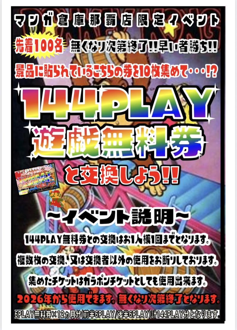 202512.13 ゲームセンター アミューズメントコーナーより年に一度のお得なイベントのお知らせ!! 本日より2026年から使用することができる144PLAY無料券配布しております(*´▽`*) 景品に貼られている144PLAY遊戯無料券を10枚集めて是非交換してください! 集めすぎてしまった場合でも週末限定のガラポンイベントで2枚1回でガラポンとして使用できます。 こちらの無料券は先着100名様限定、お1人様1回までの交換とさせていただきます。 たくさんのご来店お待ちしております(*´▽`*)!!!