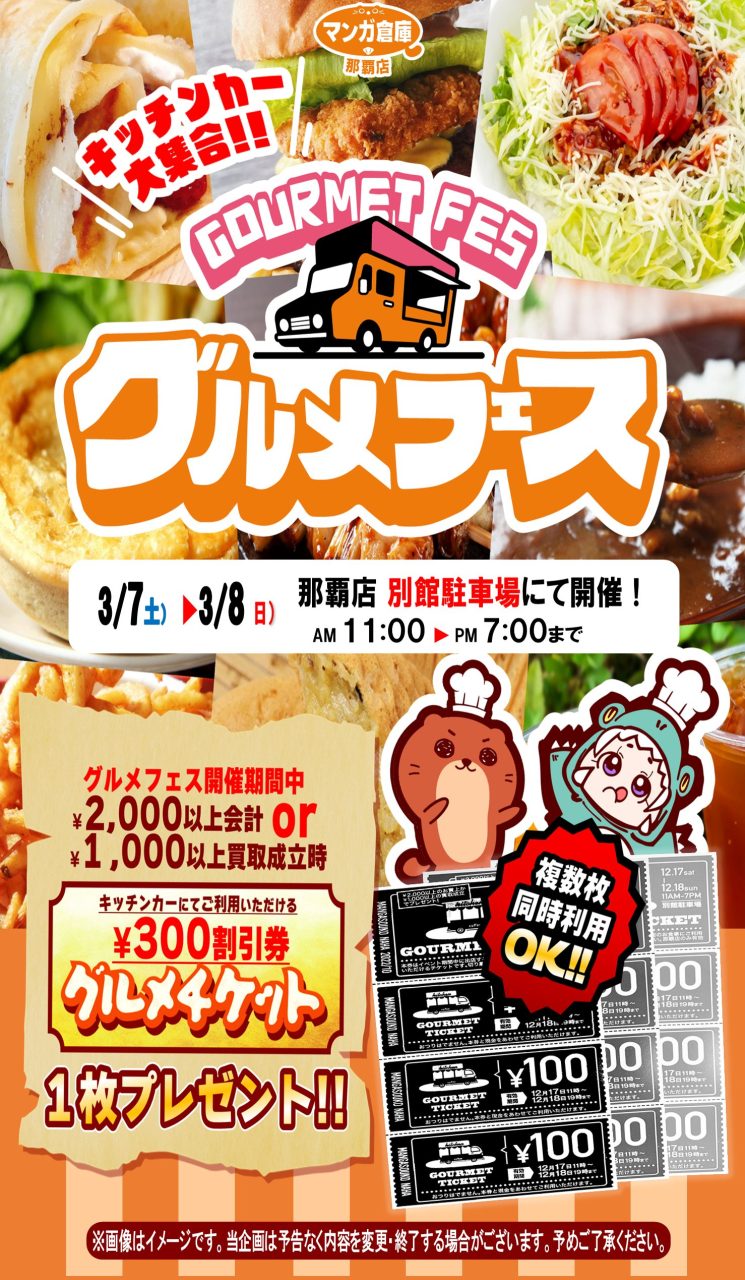 202603.02 新着情報 グルメフェス 3/7(土)・8(日)の2日間毎月恒例のグルメフェスを開催いたします。 ¥2000以上の購入または¥1000以上の買取成立でグルメチケット1枚配布いたします。 複数枚同時使用可能なので、買って・売って・食べていってみてはいかが?