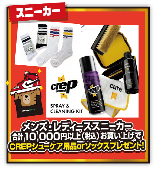 202412.27 ファッション スニーカーコーナーよりプレゼント企画のご案内‼ 今回のチラシのセール期間中に、スニーカーを合計10,000円以上(税込)ご購入頂いたお客様にcrepのシューケア用品をおひとつプレゼントいたします!!!! 対象のスニーカーは、値札の値段の右上の番号が【144,145,148,149】の商品になります! ぜひ、年末年始もマンガ倉庫那覇店でスニーカーGETしちゃってください~~~!!(^^)/☆彡