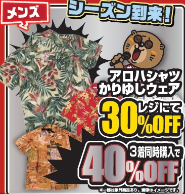 メンズアロハ、かりゆしシャツのセールを行います!!30%引きのセールですが、、、3着以上お選びいただくとなんと40%引きになります!!!!