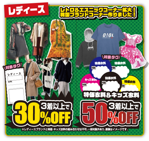 202412.06 ファッション レディースより、クリスマスセールのご案内! 12月7日(土)~12月22日(日)の期間中、お得なSALEを行います! レディースブランド衣料が、3着以上同時購入でレジにて30%OFFになります。さらに、特価&キッズ衣料は3着以上同時購入でレジにて50%OFFになります!! ※各種割引併用不可・一部SALE対象外商品もありますのでご注意ください。 是非、この機会にレディースコーナーまでお越しくださいませ。