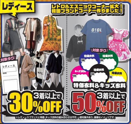 レディースブランド衣料が、3着以上同時購入でレジにて30%OFFになります。