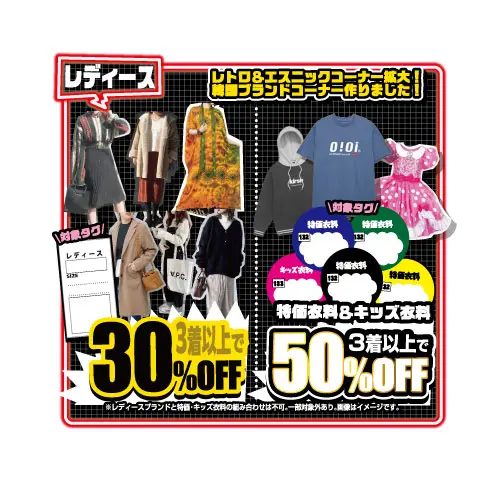 さらに、特価&キッズ衣料は3着以上同時購入でレジにてなんと50%OFFになります!!