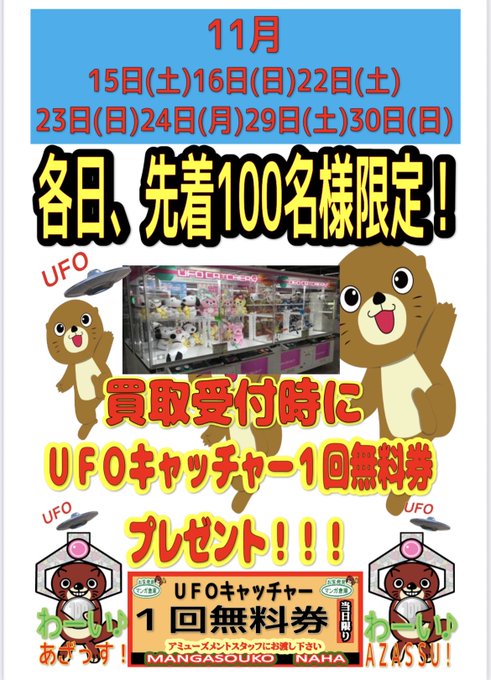 202511.10 イベント 先着100名様限定!買取受付時にUFOキャッチャー1回無料券配布イベント!! 『各日先着100名様限定!買取受付時にUFOキャッチャー1回無料券配布イベント開催!』 開催期間は11月の15日(土)16日(日)、22日(土)23日(日)24日(月)、29日(土)30日(日)となります! 買取するならお得に売ってお得に遊べるこの期間中に是非マンガ倉庫那覇店へ!!