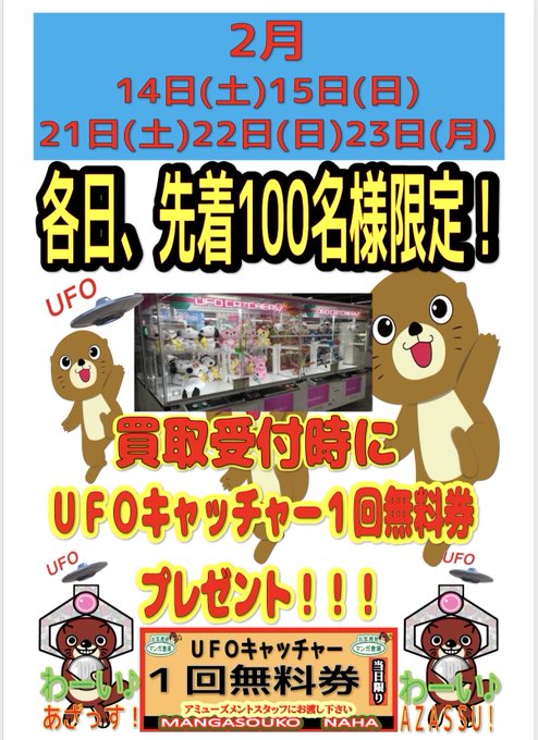 202602.10 イベント 先着100名様限定!買取受付時にUFOキャッチャー1回無料券配布プレゼント!! 『各日先着100名様限定!買取受付時にUFOキャッチャー1回無料券配布イベント開催!!』 開催期間は2月の14日(土)15日(日)、21日(土)22日(日)23日(月)です!! 買取するならお得に売ってお得に遊べるこの期間中に是非マンガ倉庫那覇店へ!!