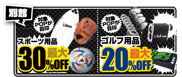 202511.14 別館 別館セール情報 チラシ期間中スポーツ用品最大30%OFF ゴルフ用品も最大20%・釣具も最大20%OFFセールやります。 在庫あるだけなので無くなる前にお求めください。 欲しかった商品が見つかるかも!