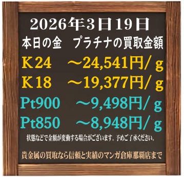 202603.19 金/プラチナ 本日の金/プラチナの買取価格! 年中無休でいつでも無料査定 貴金属買取ならおまかせマンガ倉庫那覇店 20年間の買取実績数が県内最大級である秘訣!! ぜひ他店と比べてみてください!!