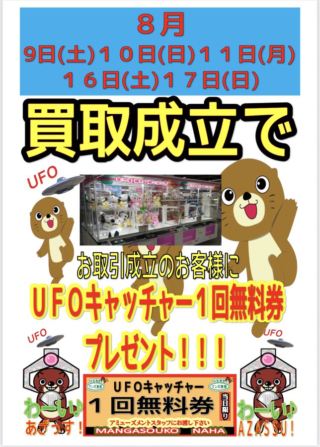 202508.06 イベント 買取成立でUFOキャッチャー1回無料券配布イベント!! 『買取成立でUFOキャッチャー1回無料券プレゼント』イベント開催!! 開催期間は8月の9日(土)10日(日)11日(月)16日(土)17日(日)となります!! 買取するならお得に売ってお得に遊べるこの期間中に是非マンガ倉庫那覇店へ!!!