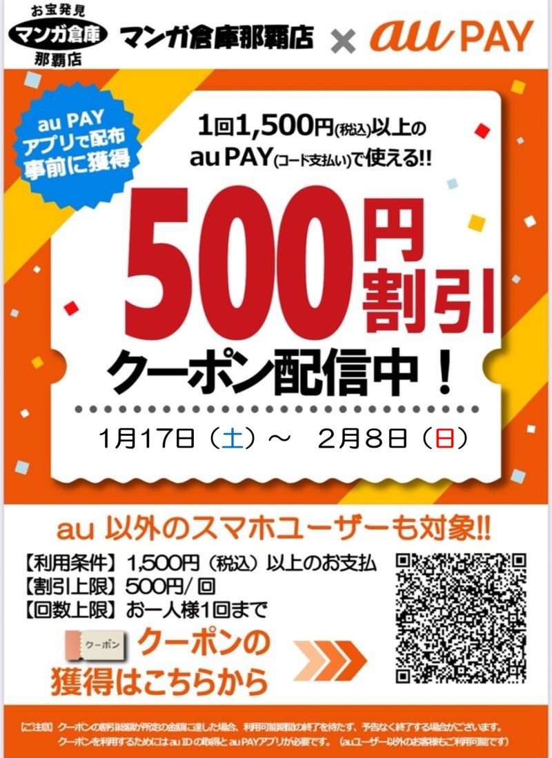 202601.16 イベント au PAY キャンペーン 1/17start!! 1回のお会計、 税込1500円以上のauPay(コード支払い)決済で使える 500円割引クーポン配信! *auPayアプリで配布!事前に獲得をお願いします! 配布期間:1/17 〜 2/8 迄 おひとり様1回まで お支払い後の申し出、利用は不可となります。 au以外のスマホユーザーも対象! QRコードをぜひ読み込んでご利用ください!