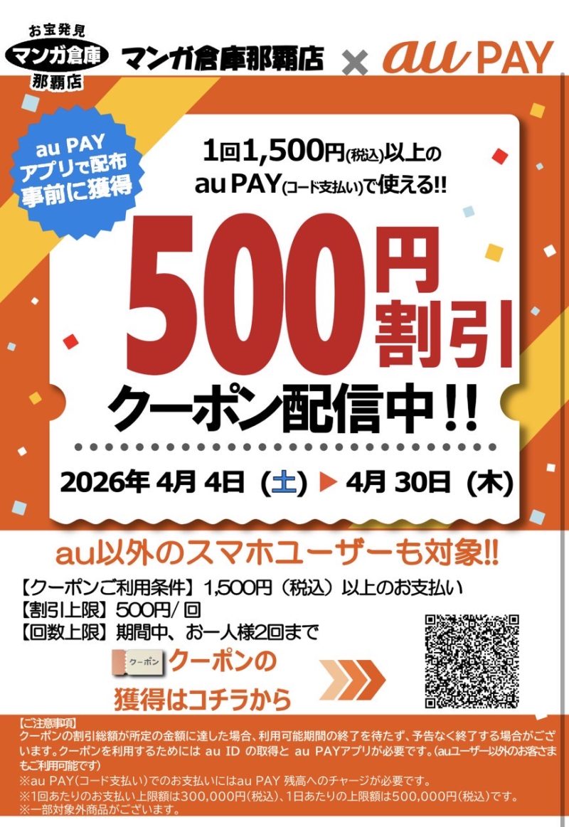 202604.04 イベント au PAY キャンペーン 4/4 start!! 1回のお会計、 税込1500円以上のauPay(コード支払い)決済で使える 500円割引クーポン配信! *auPayアプリで配布!事前に獲得をお願いします! 配布期間:4/4 〜 2/8 迄 おひとり様2回まで(上限有) お支払い後の申し出、利用は不可となります。 au以外のスマホユーザーも対象! QRコードをぜひ読み込んでご利用ください!