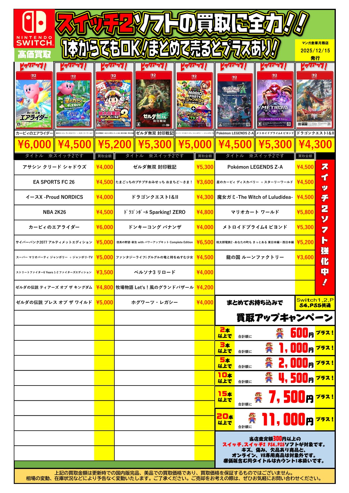 スイッチソフト、スイッチ2ソフト買取更新しました!