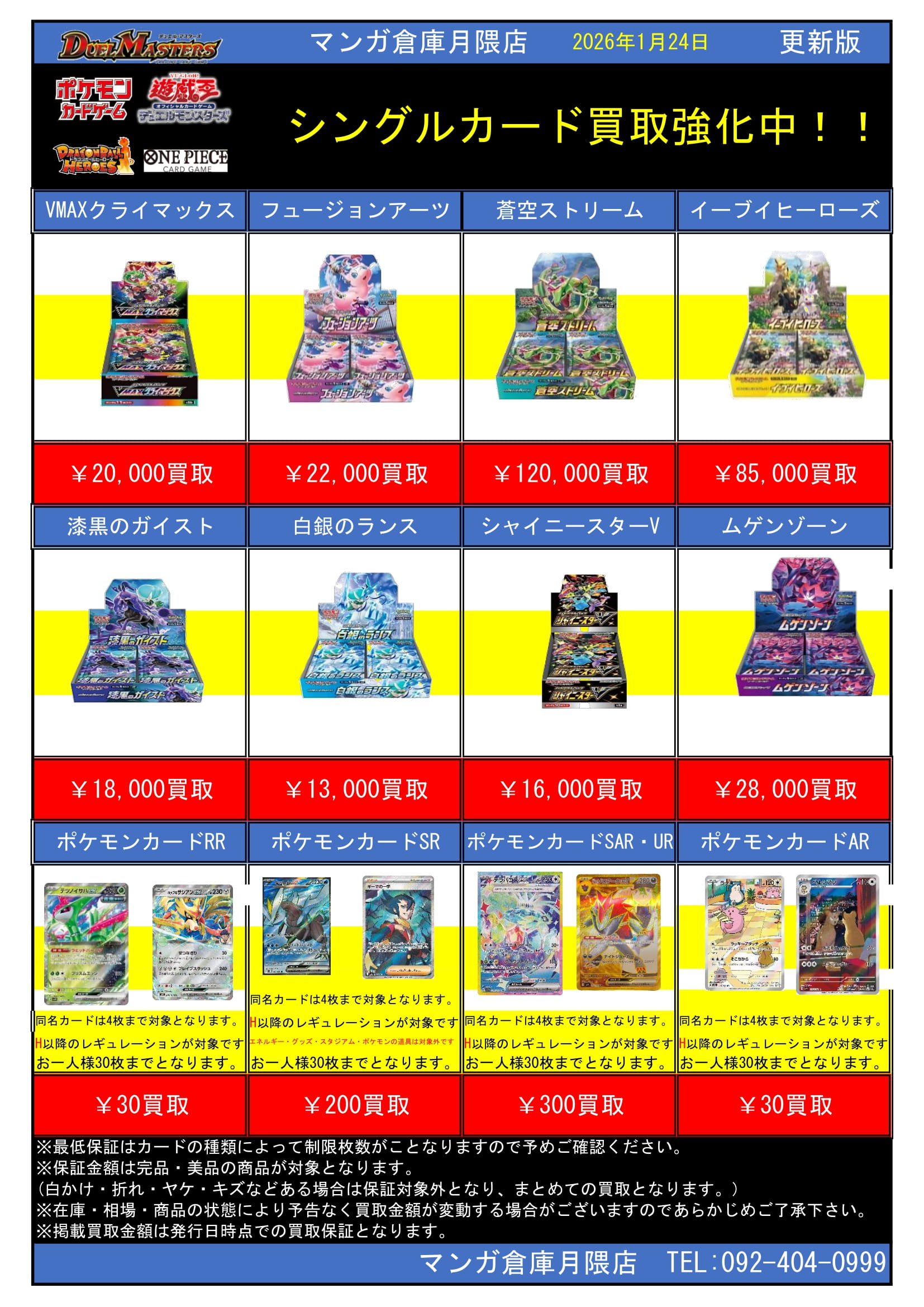 202601.24 カード ★カードコーナーより、BOX買取金額変更いたしました!★ カードコーナーより、BOX買取金額変更いたしました! ※2026/1/24 現在の価格となります。 在庫状況などによってお値段が変動いたします。予めご了承ください。