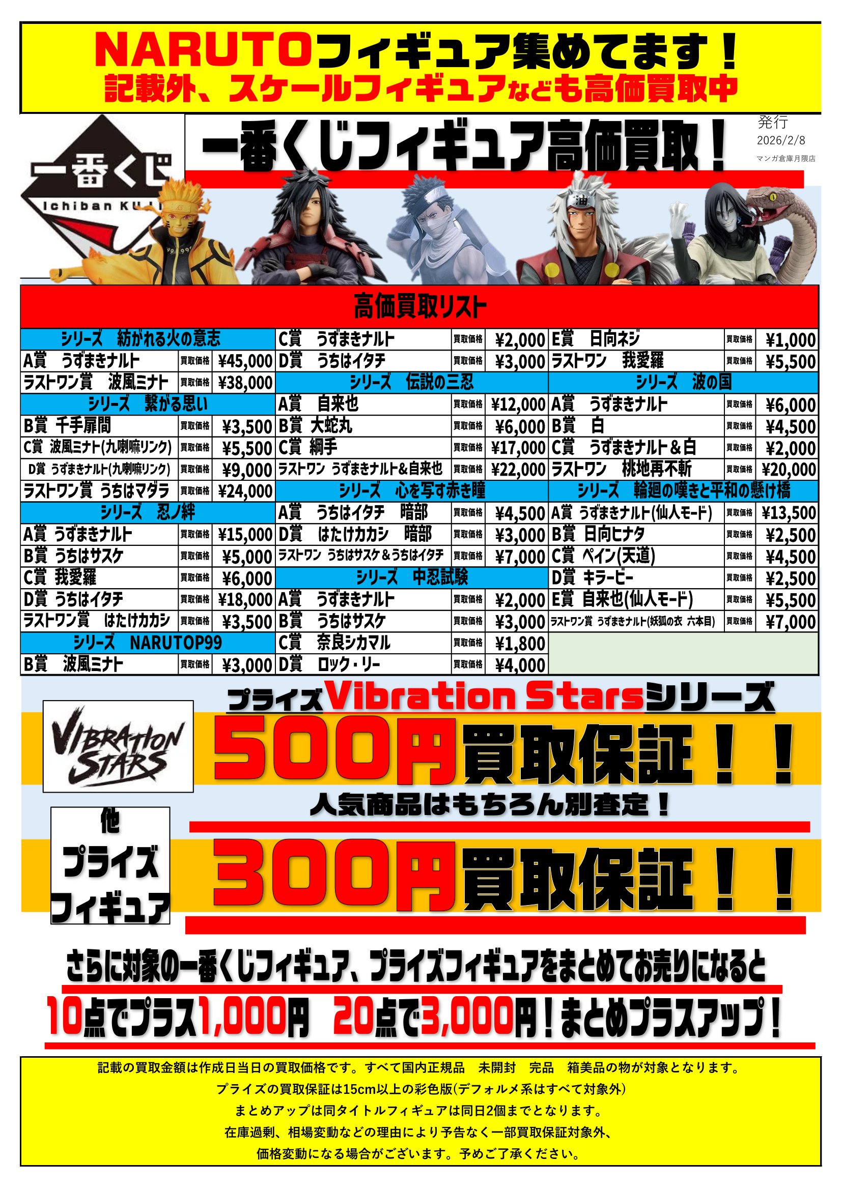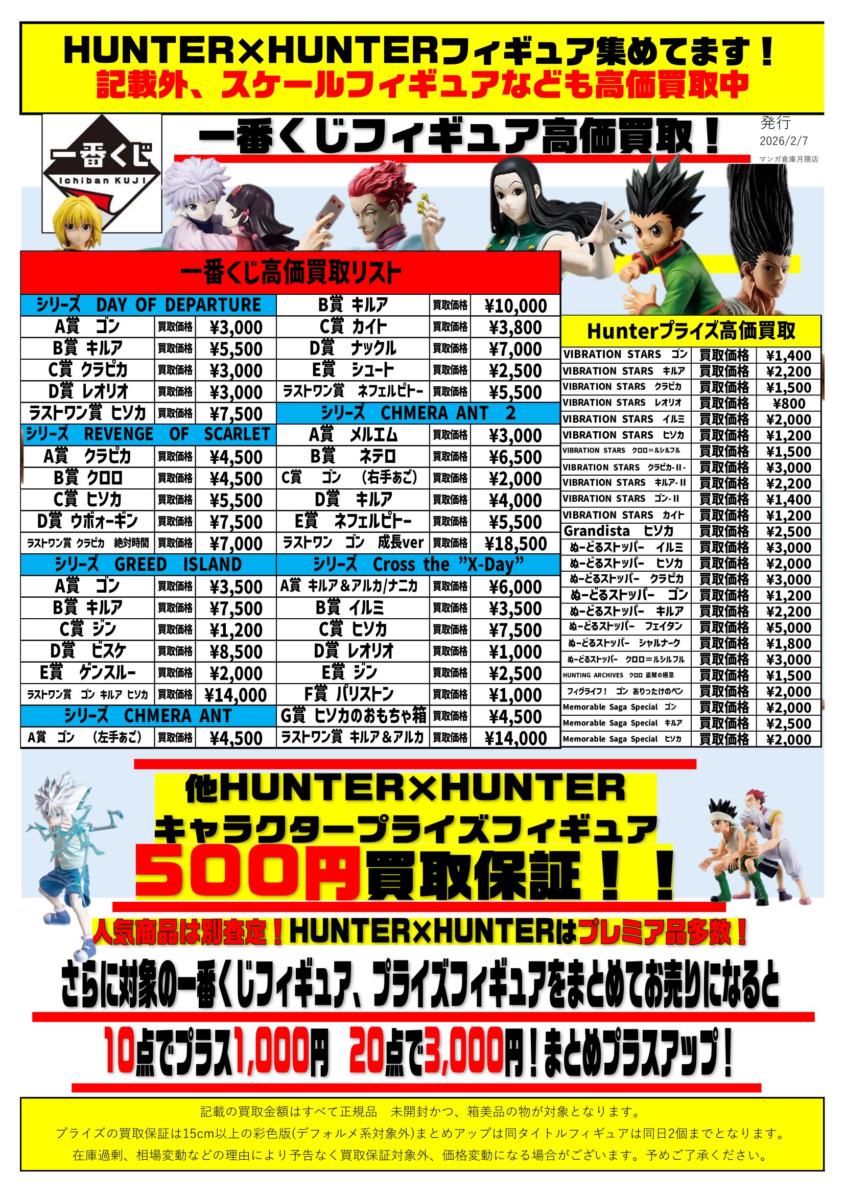 202602.08 おもちゃ ハンター×ハンター、ナルト、呪術廻戦フィギュア買取更新しました! ハンター×ハンター、ナルト、呪術廻戦フィギュア買取更新しました! HUNTER×HUNTER、NARUTOに大幅アップの商品多数! お買取りお待ちしております!