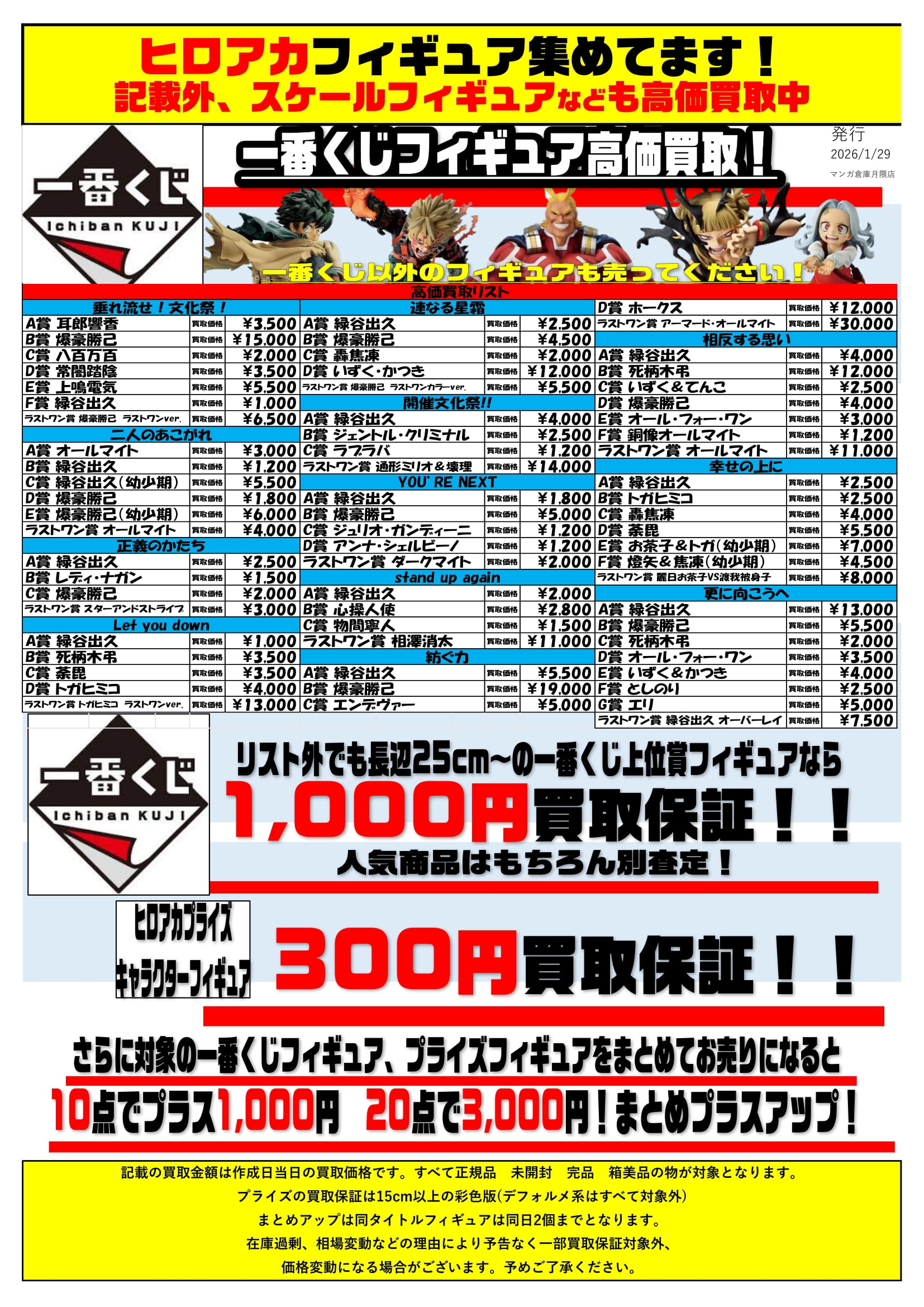 202601.29 おもちゃ ヒロアカ一番くじフィギュア高価買取リストはじめました! ヒロアカ一番くじフィギュア高価買取リストはじめました! プライズフィギュアも超強化買取中! 一番くじ、プライズ共通でまとめアップもあります! ヒロアカフィギュアお売りならぜひ当店まで!