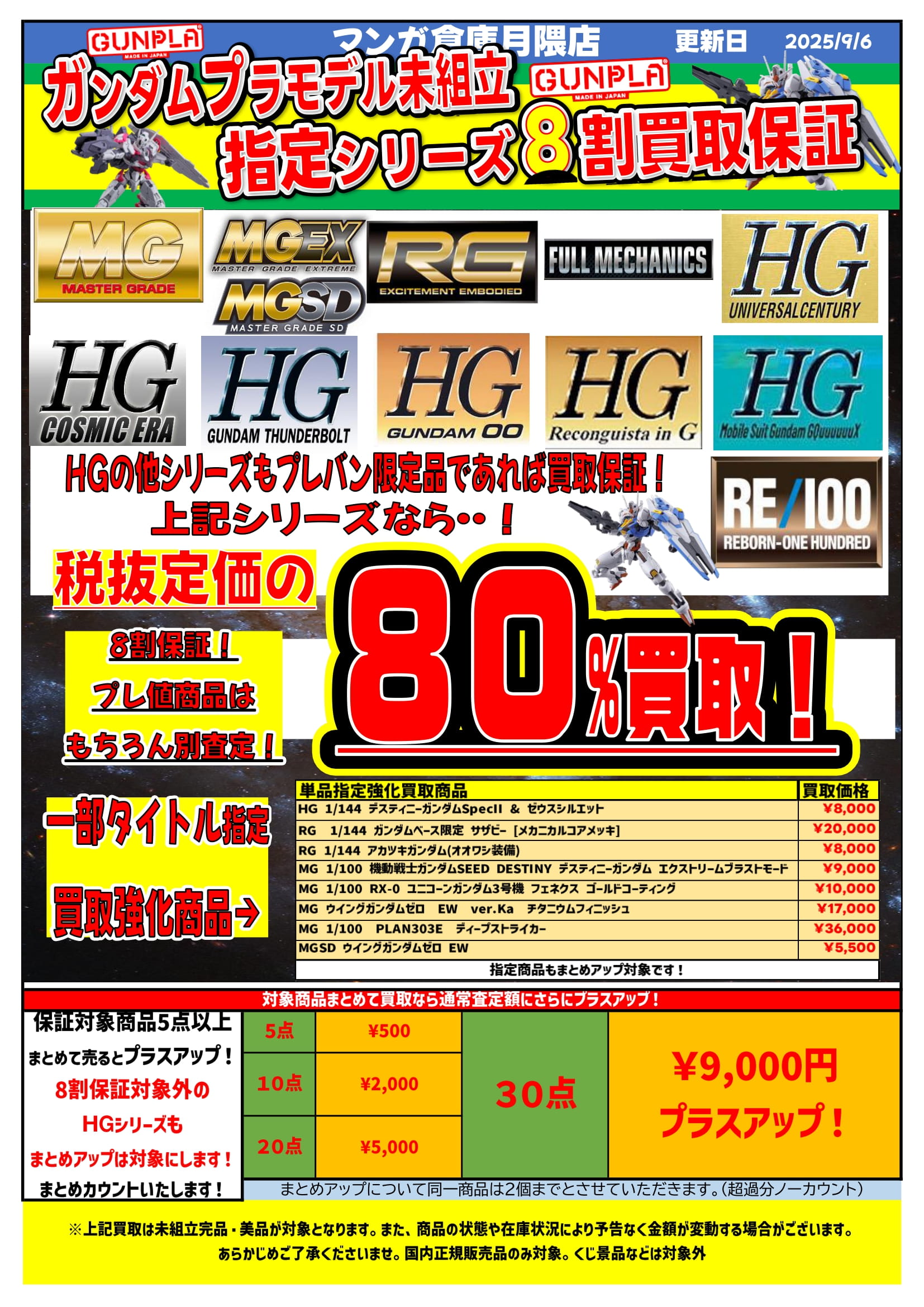 202509.07 おもちゃ 今月もガンプラ、メタルビルド高価買取継続中! 今月もガンプラ、メタルビルド高価買取継続中! ガンプラまとめアップ、ジークアクスも追加して好評継続中です! ガンダムプラモデル、メタルビルド、他超合金トイなど、お買取りはぜひ月隈店まで!