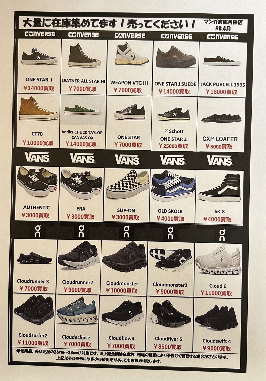 202604.15 ファッション 靴コーナーより! converse,vans,onの買取保証始めました! 靴コーナーより! converse,vans,onの買取保証始めました! 是非一度当店へお持ち下さい!