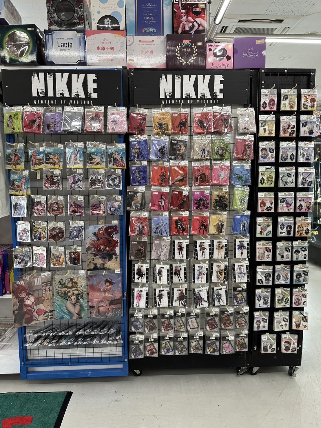 1階おもちゃコーナー、レジ前に人気アプリゲーム『勝利の女神 NIKKE』の関連グッズを展開してます!